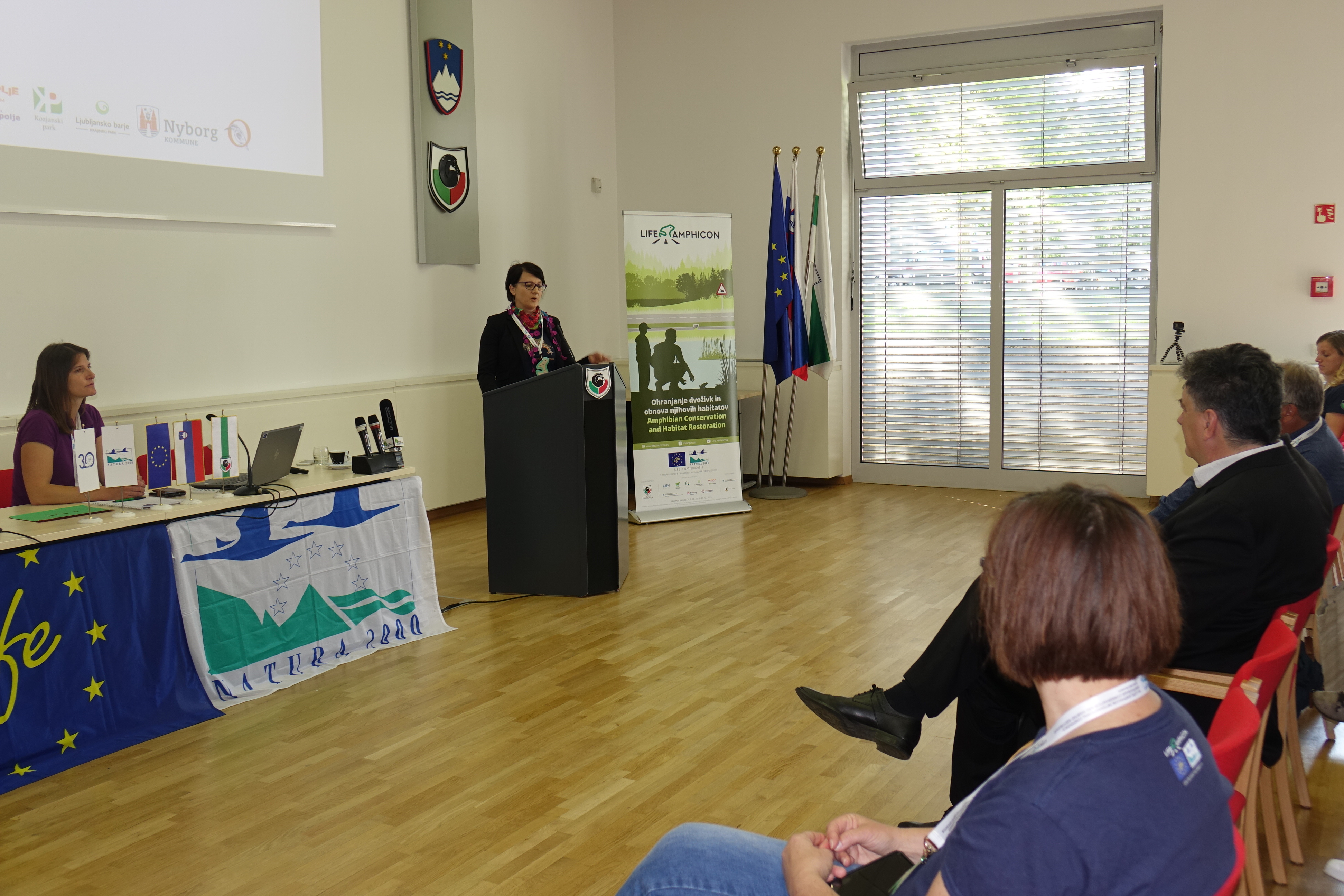 Partnerji projekta LIFE AMPHICON in uvodni govorniki – dr. Peter Verlič, župan občine Grosuplje, Angelo Salsi, vodja programa LIFE pri agenciji CINEA in Suzana Levstek, vodja projekta LIFE AMPHICON.